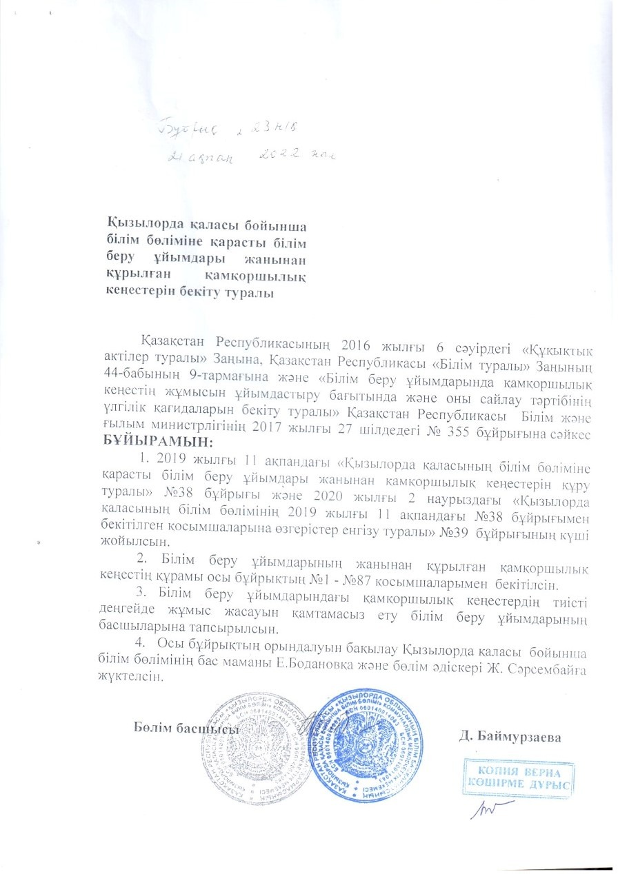 Қамқоршылық кеңес төрағасы Төребаев Мұхит Мұратбекұлы сөз алып, кеңес мүшелеріне өз алғысын білдіріп, бірлесіп жұмыс жасауға шақырды. Жыл бойы мектепте әлеуметтік – мәдени іс-шараларды өткізуге ат салысу (мектеп ұжымымен, оқушылармен), әлеуметтік аз қамтамасыз етілген балаларды анықтау, көмек көрсету үшін заңды және тұлғаларға ашық хат дайындау, қайырымдылық шараларын тарту, оқушылар арасында тәрбиелік іс- шараларды ұйымдастыру барысында арнайы сала мамандарымен кездесулерді жүйелі ұйымдастыру, мектептің материалдық техникалық базасын жаңа оқу жылына дайындауға байланысты жоспарлы жұмыстарды атқаруға кеңес мүшелерін шақырды.