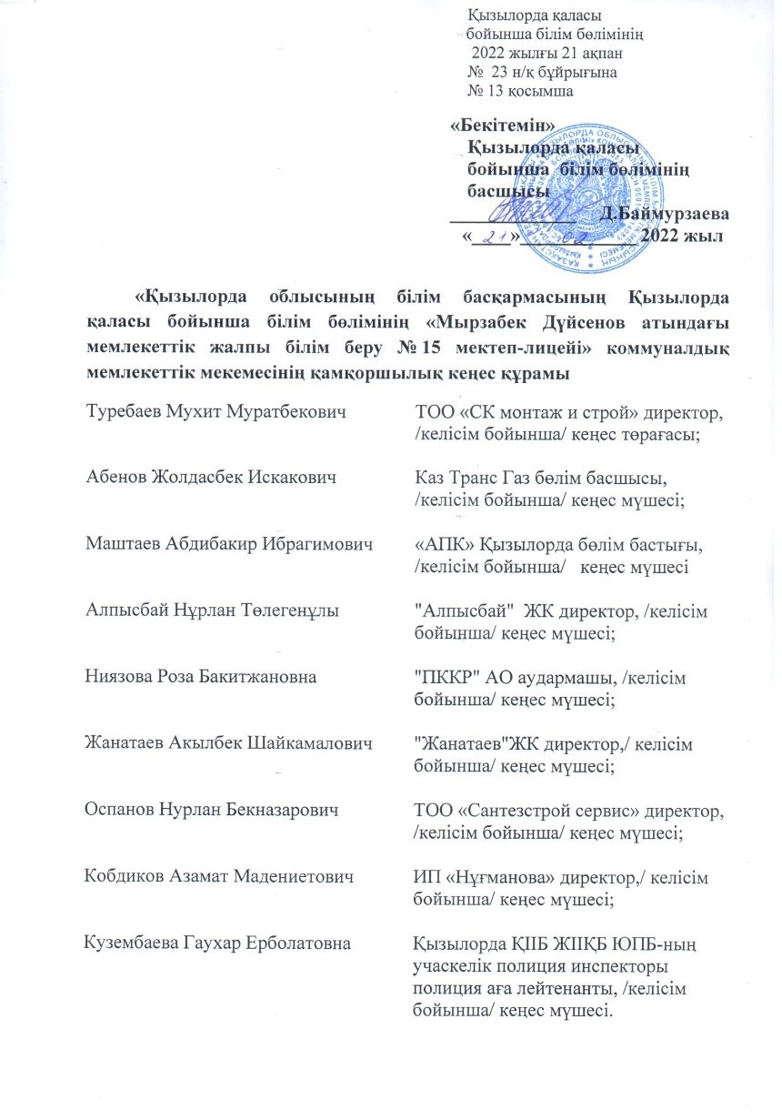 М.Дүйсенов атындағы №15 мектеп-лицейінде қамқоршылық кеңестің жиналысы өткізілді. Қамқоршылық кеңесінің бағыттары: білім беру, әлеуметтік – мәдени, сауықтыру, дамыту бағытындағы іс – шараларға көмек көрсету. Әлеуметтік тұрғыдан осал қамтылған отбасыларынан шыққан оқушылардың тұрмыс жағдайларымен жұмыспен қамтылуын жақсарту.